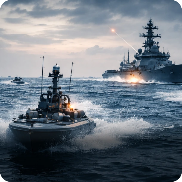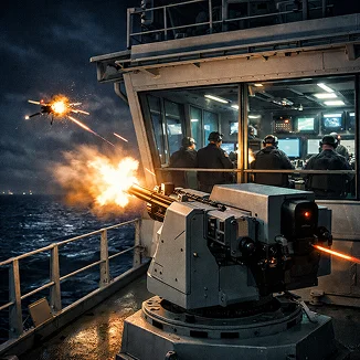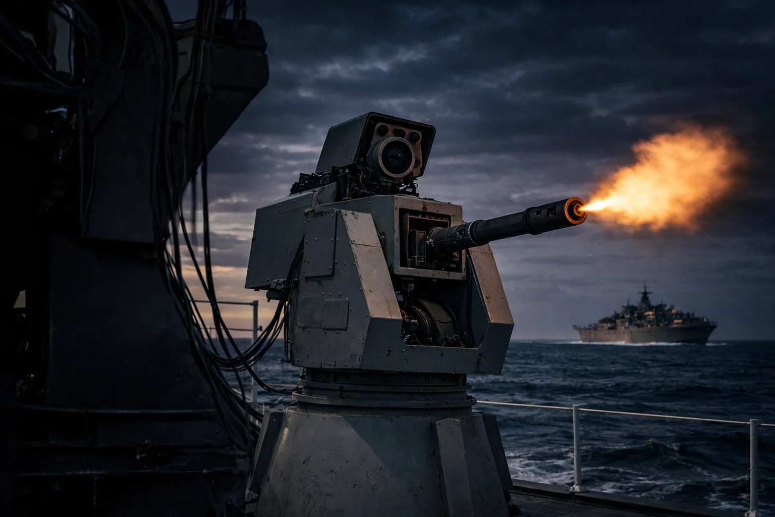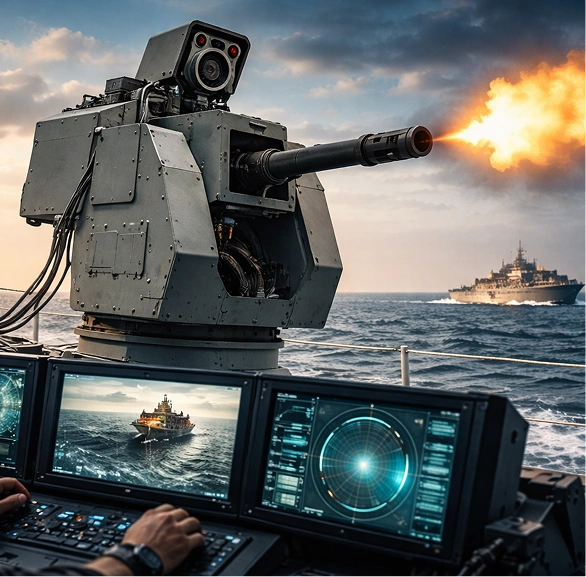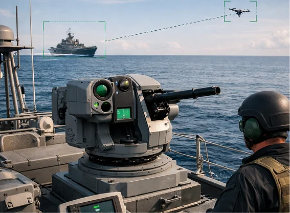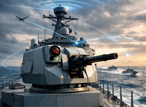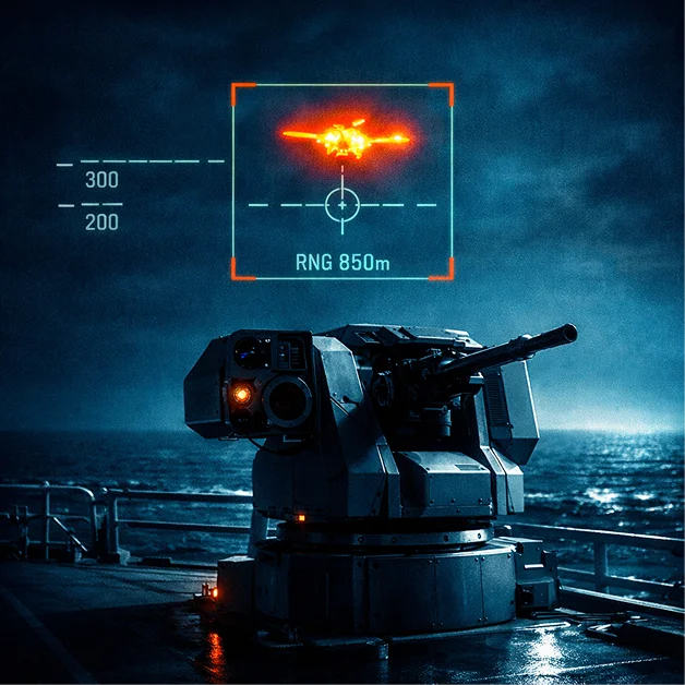 On warships, ROWS act as a hardened close-in defence layer against surface threats, UAVs, and swarm attacks. Fully networked with ship sensors, they reinforce layered maritime dominance in contested waters.